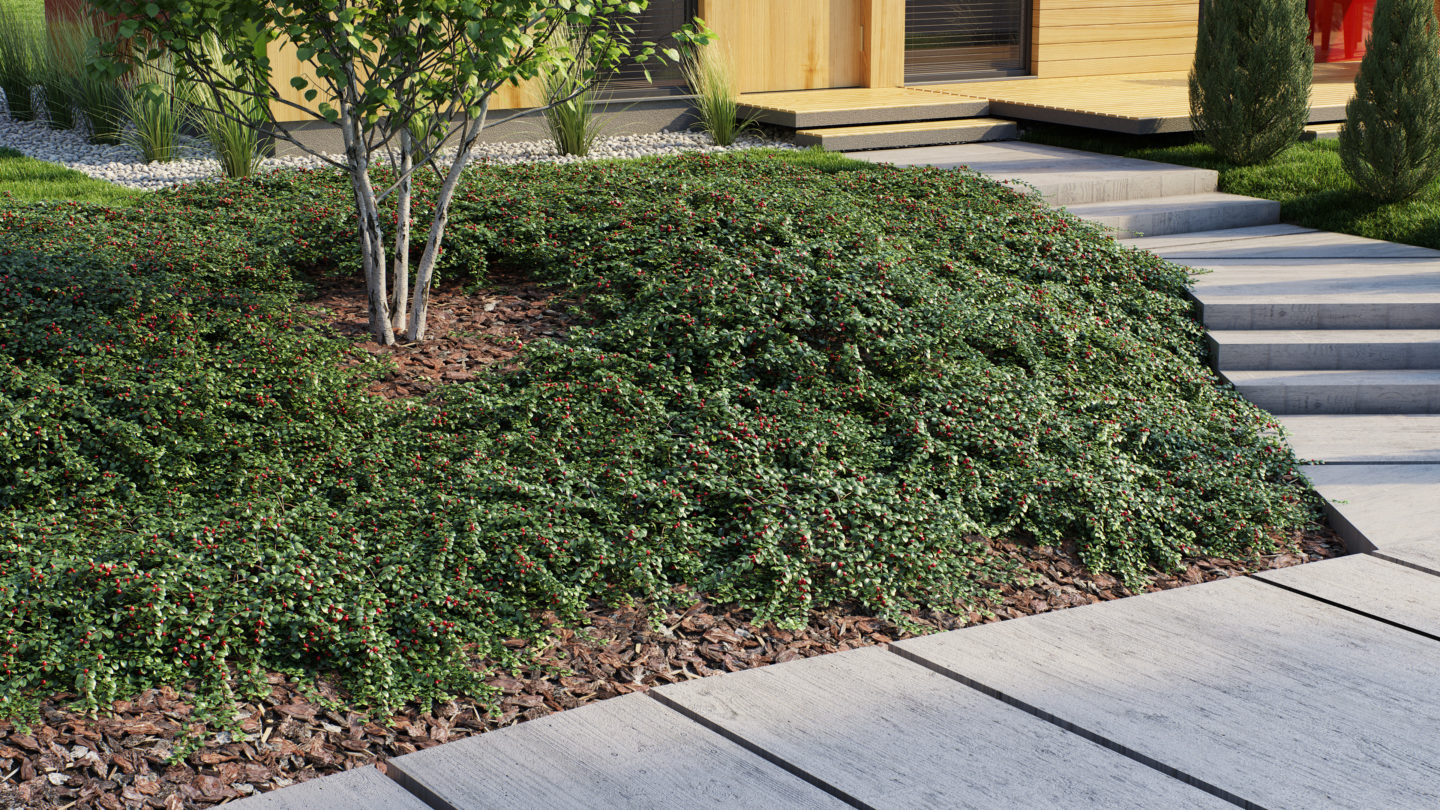 Cotoneaster dammeri is a creeping ornamental shrub with evergreen foliage and decorative fruits. Bearberry makes a very attractive ground cover where low-growing vegetation is needed. As an arch-viz artist, You will certainly appreciate this asset in your library.